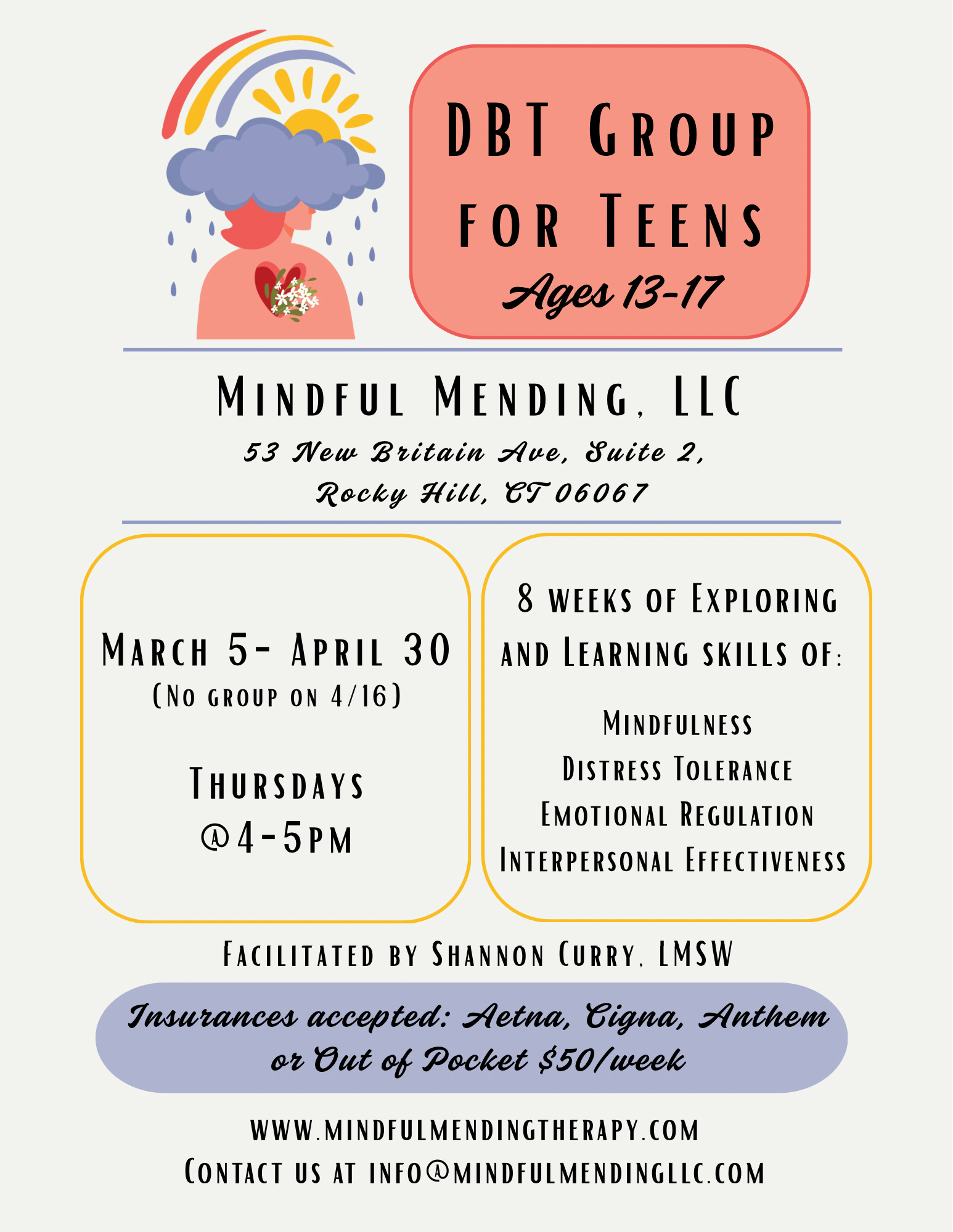 Sessions will take place either at the office in Rocky Hill or Cromwell as well as virtually online through a link provided. If choosing to have sessions virtually, session must take place in a quiet, private environment to ensure the best therapeutic care. Our time together will be focused on learning and utilizing coping, communication and everyday life skills to manage thoughts and emotions within yourself and your relationships.